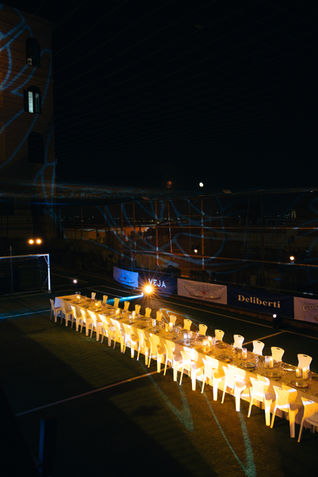 To celebrate Veja’s “Panenka” sneakers, Giotto transformed a football pitch beneath Vesuvio into a unique dining experience. His creative direction extended from the initial boutique installation to a hand-sewn tablecloth, painted plates, menus designed like stadium tickets and more.